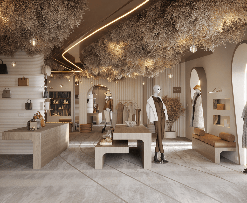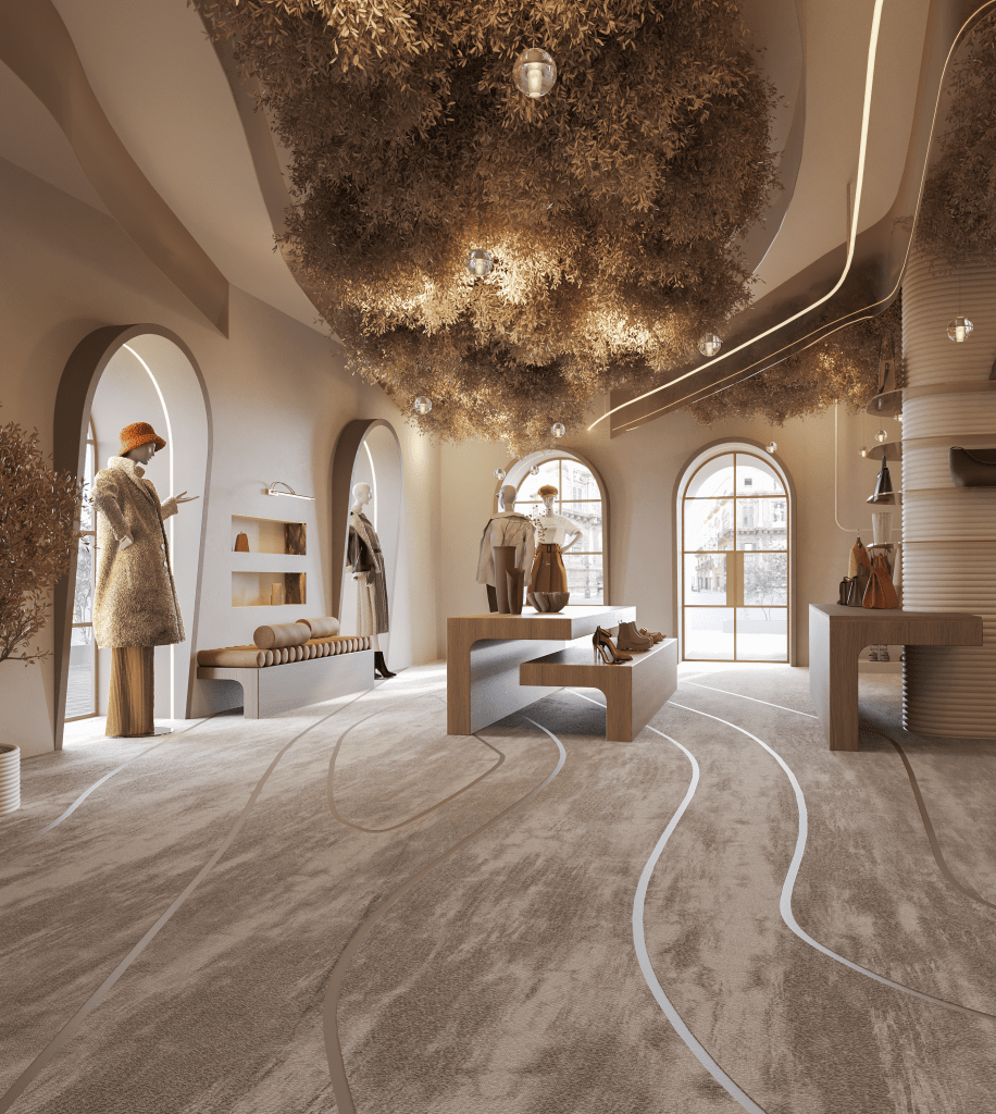 Duvarlardan tavana kadar uzanan yaprak dokulu tavan enstalasyonu, doğaya gönderme yaparken; iç mekânın akışkan geometrisi, kullanıcıyı mekânla estetik bir ilişkiye davet eder. Her vitrin, sadece bir ürün değil; bir hikâyenin, bir yaşam stilinin parçası olarak yer alır.