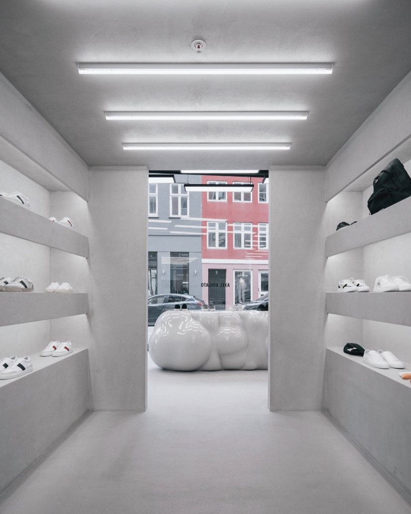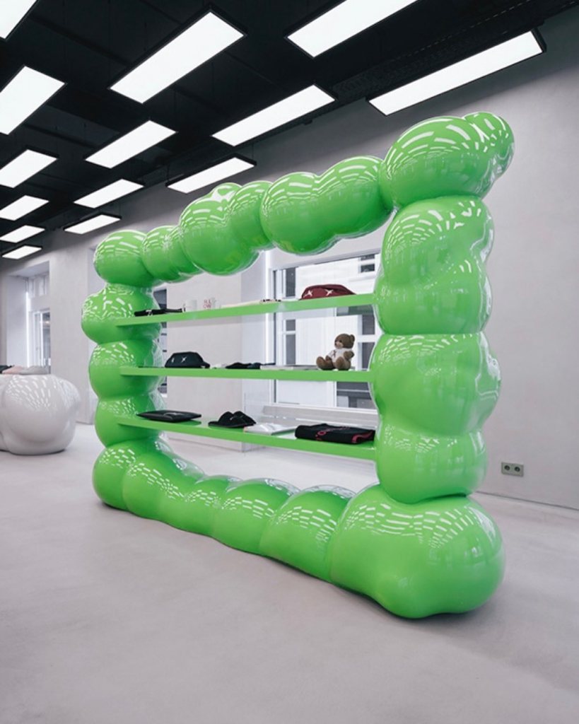 AXEL mağazası, heykelsi öğeler ile rafine bir mekânsal dilin birleşimiyle çağdaş perakende tasarımında dikkat çekici bir etki yaratır. Mekânın merkezinde yer alan parlak yeşil, organik biçimde şekillendirilmiş raf sistemi yalnızca bir sergileme elemanı olarak değil, aynı zamanda mağazanın heykelsi kimliğini yansıtan bir unsur olarak da işlev görür. Bu tasarım yaklaşımı, geleneksel alışveriş deneyimini daha etkileşimli ve sürükleyici bir deneyime dönüştürür.
