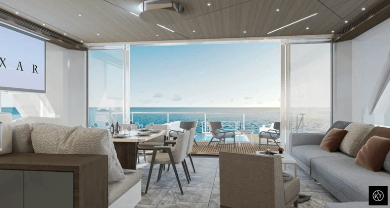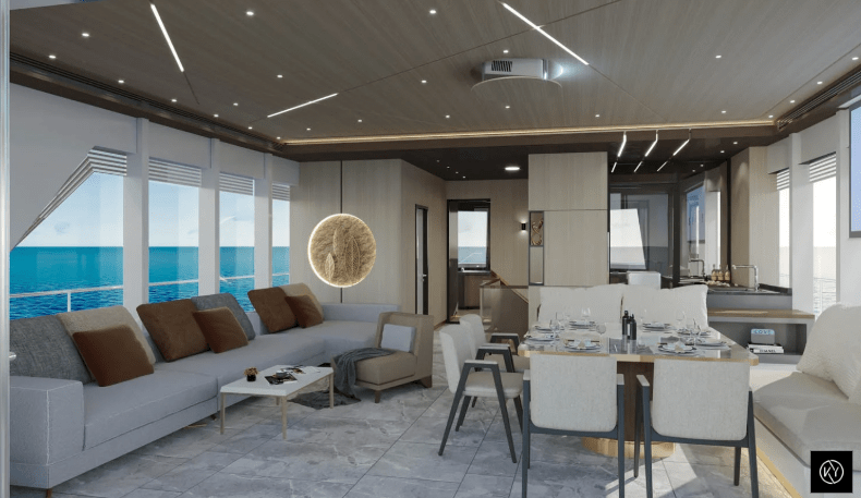 Yatın iç mekânı, doğayla bütünleşik bir yaşam deneyimini estetik ve ergonomiyle harmanlarken, kullanıcı alışkanlıkları ve bireysel konfor ihtiyaçları göz önünde bulundurularak şekillendirilmiştir. Açık tonlu doğal yüzeyler, denizle kurulan görsel ilişkiyi güçlendiren geniş açıklıklar ve mekânın akışını destekleyen çizgisel aydınlatmalar, iç mekânda hem sakin hem de çağdaş bir atmosfer yaratır.
