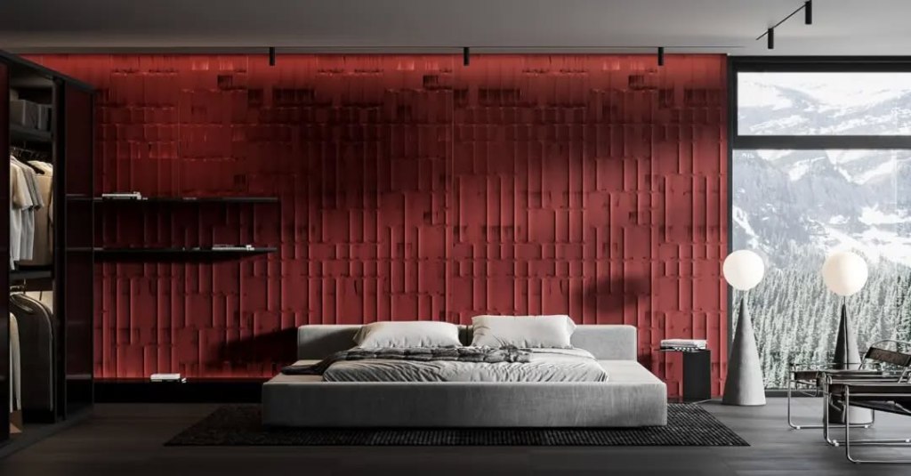 Santa Monica House’un yatak odası tasarımı, dokunsal lüks ve minimalizmin cesur bir ifadesidir. Koyu kırmızı tonlarında üç boyutlu heykelsi bir duvarla tanımlanan bu alan, çevresindeki yumuşak nötr tonlara zarif bir zıtlık oluşturarak görsel bir odak noktası hâline gelir.