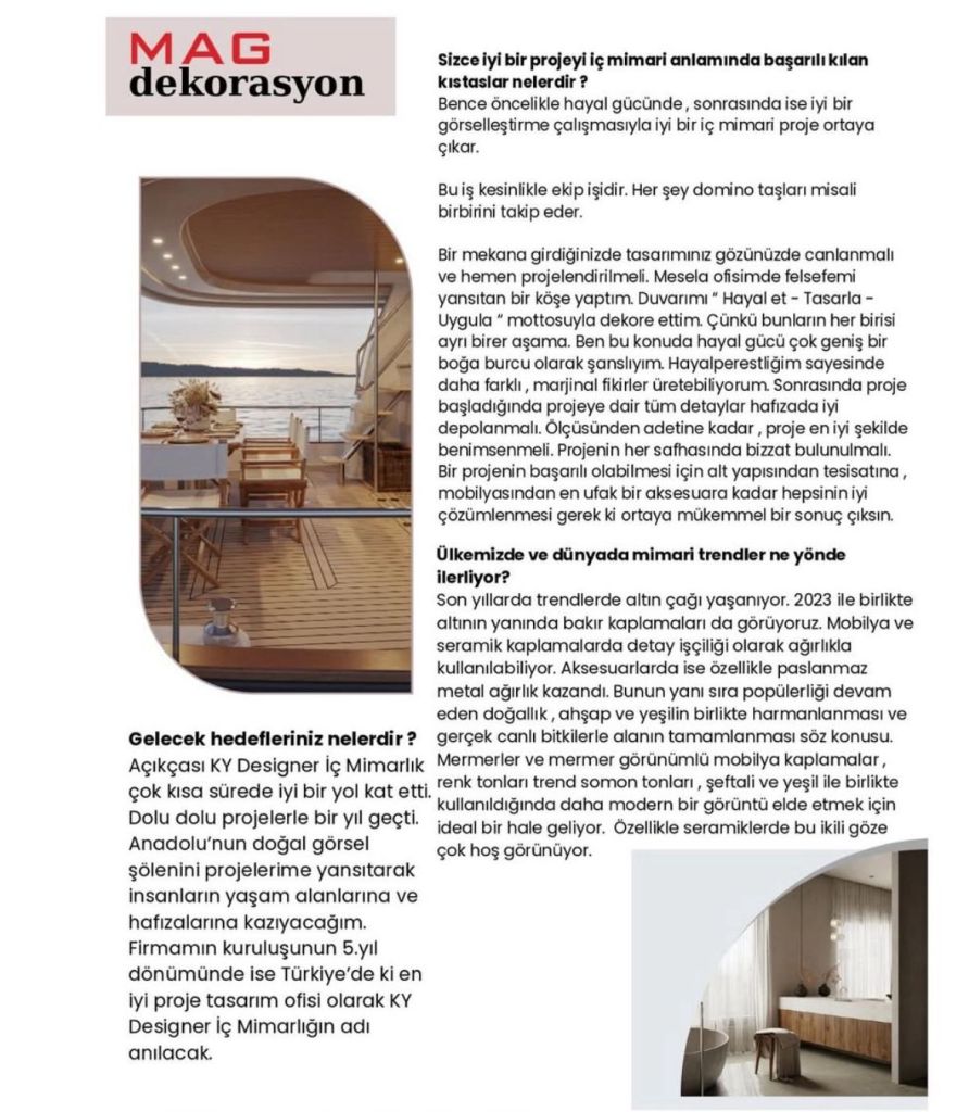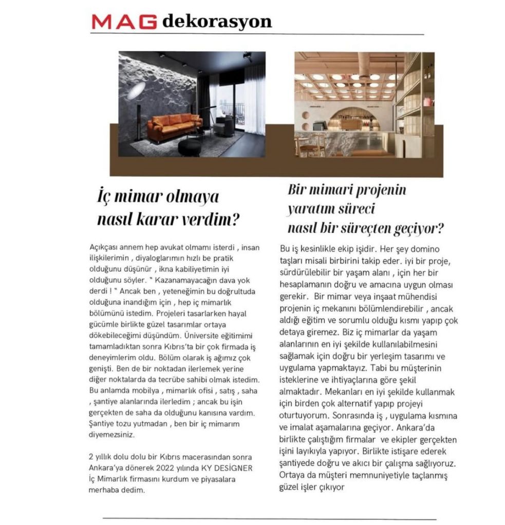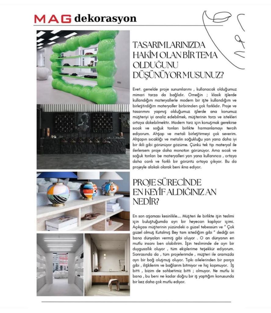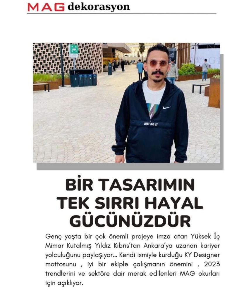 MAG Dekorasyon dergisi, genç yaşta birçok başarılı projeye imza atan ve iç mimarlık kariyerini Kıbrıs’tan Ankara’ya taşıyan Yüksek İç Mimar Kutalmış Yıldız ile özel bir röportaj gerçekleştirdi.